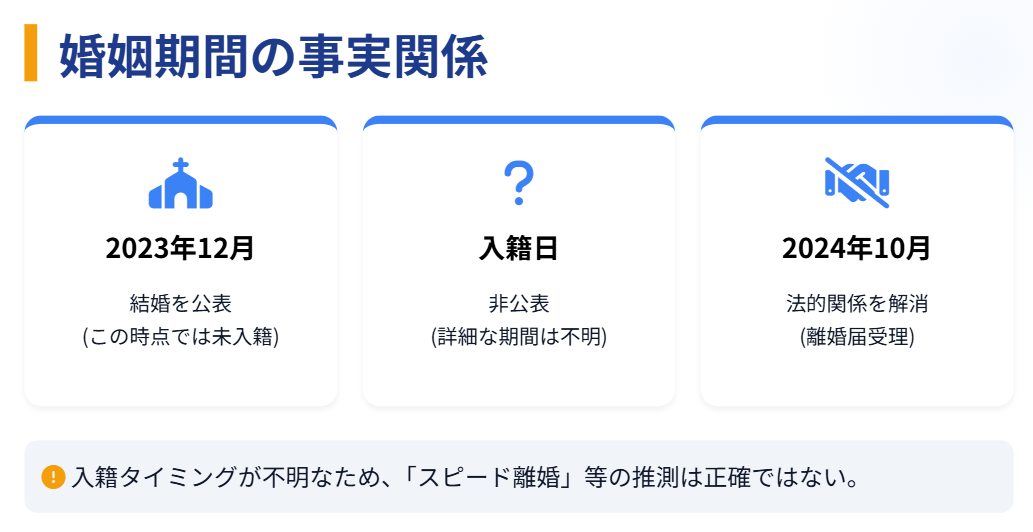 正確な入籍日がいつだったのか、その具体的な日付は公表されていません。したがって、法的な夫婦として過ごされた期間が具体的に何ヶ月だったのかを正確に知ることはできません。ネット上では「スピード離婚」といった言葉で期間を推測する声も見られますが、入籍のタイミングが不明である以上、婚姻期間の長短を断定することは適切ではないでしょう。確かなのは、2024年の10月末に離婚届が受理され、法的な関係が解消されたという事実のみです。