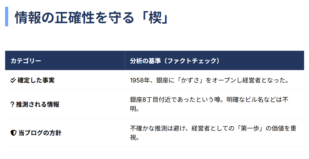 私の方で、公式な経歴記録や当時の様々な文献、インターネット上の情報を徹底的に整理して分析してみました。しかし結論から申し上げますと、現時点で確認できる公開資料からは、かずさの正確な番地やビル名を特定することは極めて難しいというのが実情です。銀座のどこかにあったことは事実として語られていますが、ネット上の噂などでよく見かける「銀座8丁目の一等地にあった」と明確に断定するには、決定的な証拠が不足している状態かなと思います。
