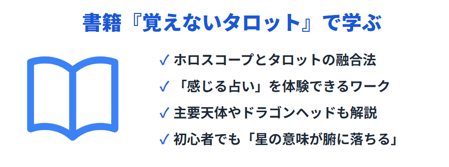 みみこ(彌彌告)さんのホロスコープ占いをさらに深く理解したい方におすすめなのが、彼女自身が執筆した書籍『覚えないタロット』です。この書籍はタロット占いを中心に構成されていますが、実は彼女の鑑定スタイルやホロスコープとの組み合わせについても詳細に記されており、占いに関心のある方にとって非常に参考になる一冊です。