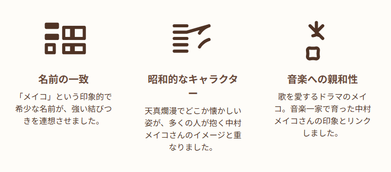 - ③ 音楽への親和性:劇中で歌を愛するメイコの姿が、音楽一家として知られた中村家の印象と重なった。
