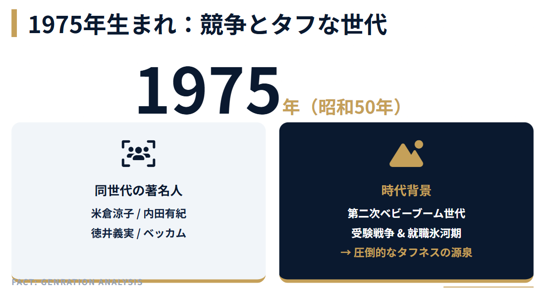 - 年齢:1975年生まれ(2025年時点で49歳?50歳)。団塊ジュニア後の世代。
