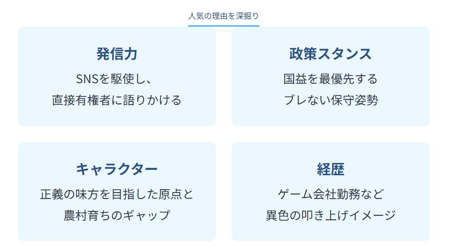 これらの要素が複合的に絡み合うことで、彼女独自の魅力が形成され、多くの有権者を惹きつけているのです。