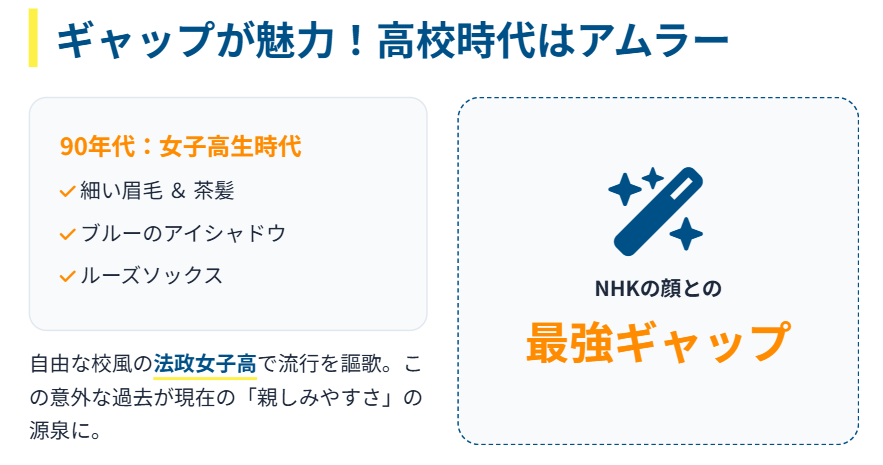 さて、ここからは少し話題を変えて、鈴木アナの意外な過去について深掘りしていきましょう。現在の『あさイチ』で見せる、ショートカットで爽やかな笑顔、そして落ち着いた語り口からは全く想像がつきませんが、実は彼女、高校時代はバリバリの「アムラー」だったという衝撃的な事実があります。
