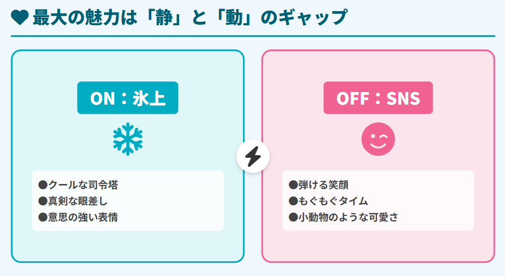 また、試合中の「もぐもぐタイム」やハーフタイムに見せる、おやつを口にしている瞬間のふとした表情も、ファンの間では「小動物みたいで可愛い」と評判です。氷の上では司令塔として厳しい顔つきで指示を出しているだけに、その落差に心掴まれる人が続出しているようです。